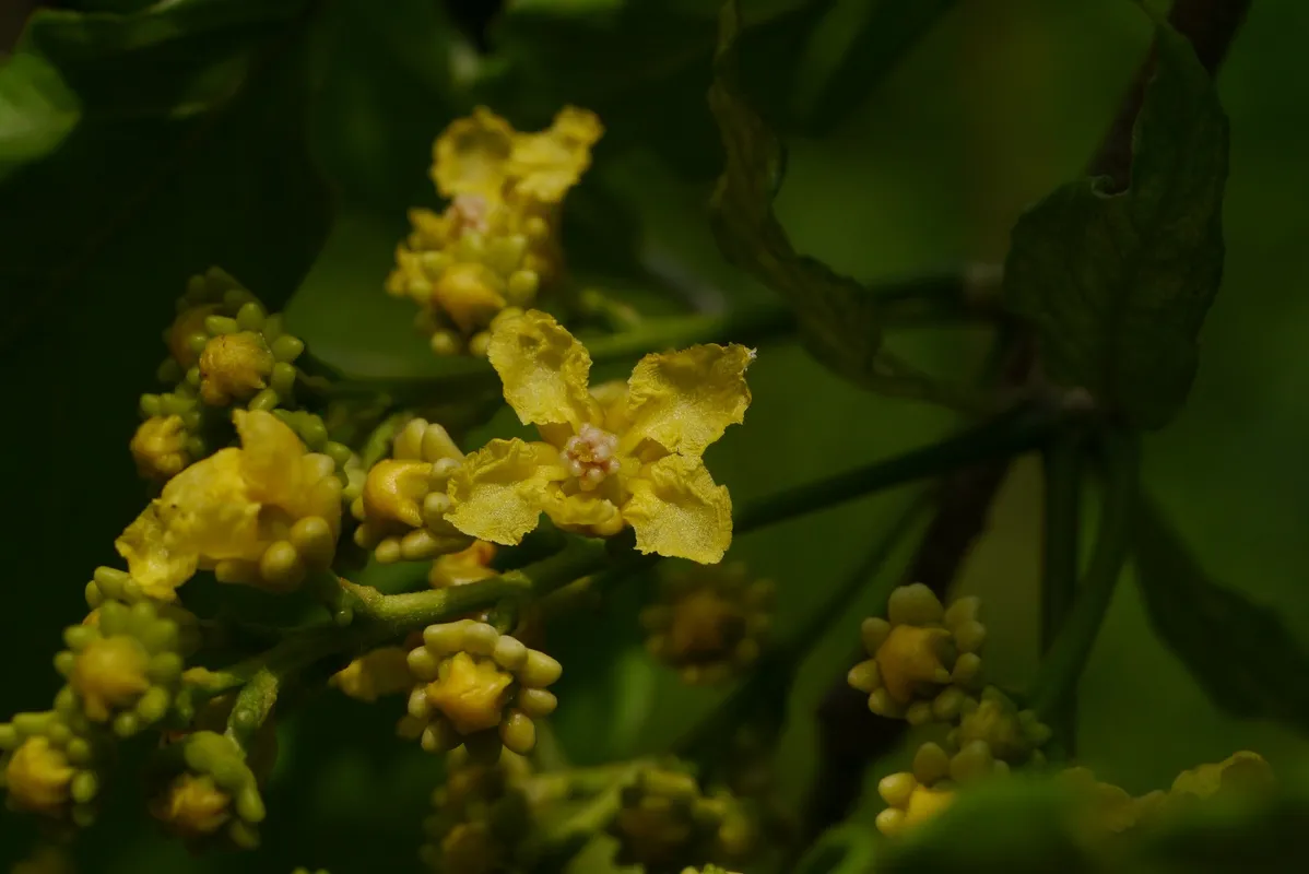 Caule: arbusto grande ou arvoreta perenifólia, de copa estreita e ramificada, de 2-5 m de altura. Folha: lâmina(s) foliar(es) bulada(s); lâmina(s) foliar(es) indumento glabra(s); lâmina(s) foliar(es) nervura(s) oposta(s). Inflorescência: pedúnculo(s) comprimento curto(s). Flor: estilete(s) livre(s); flor(es) posição alterna(s); pétala(s) margem(ns) eglandulosa(s). Fruto: drupa(s) bilocular(es); drupa(s) cor laranja.